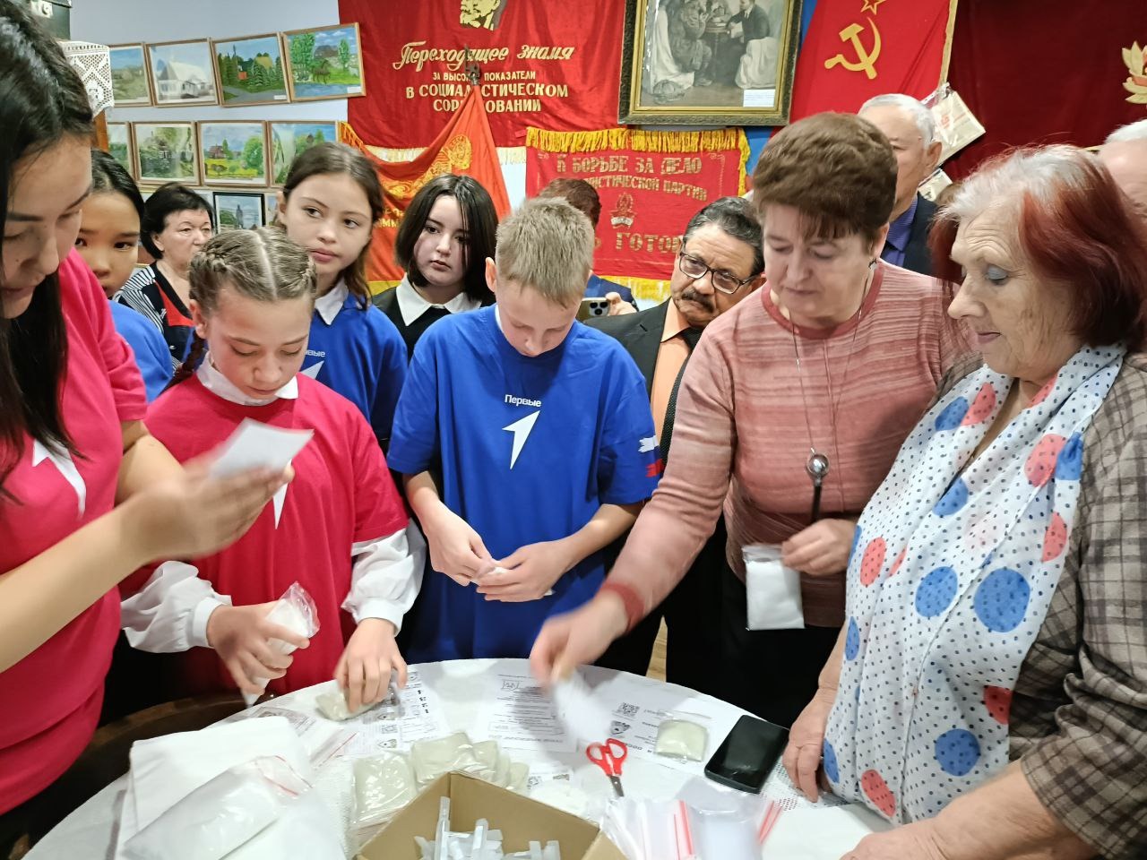 Все присутствующие стали участниками мастер-класса по изготовлению сухого душа для участников СВО. Их учителями стали учащиеся 6-го класса под руководством Исмагуловой Ралины Бокембаевны, после которого дочь участника СВО, шестиклассница Головачева Настя прочла стихотворение собственного сочинения, посвященное папе.
