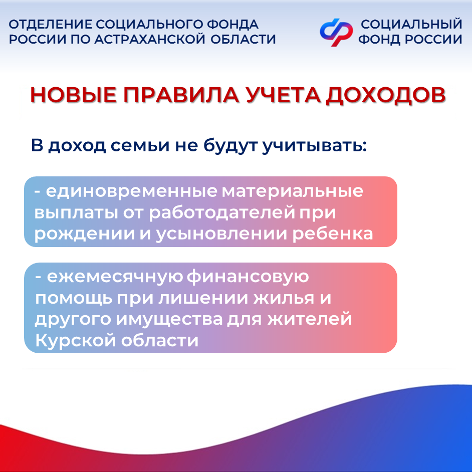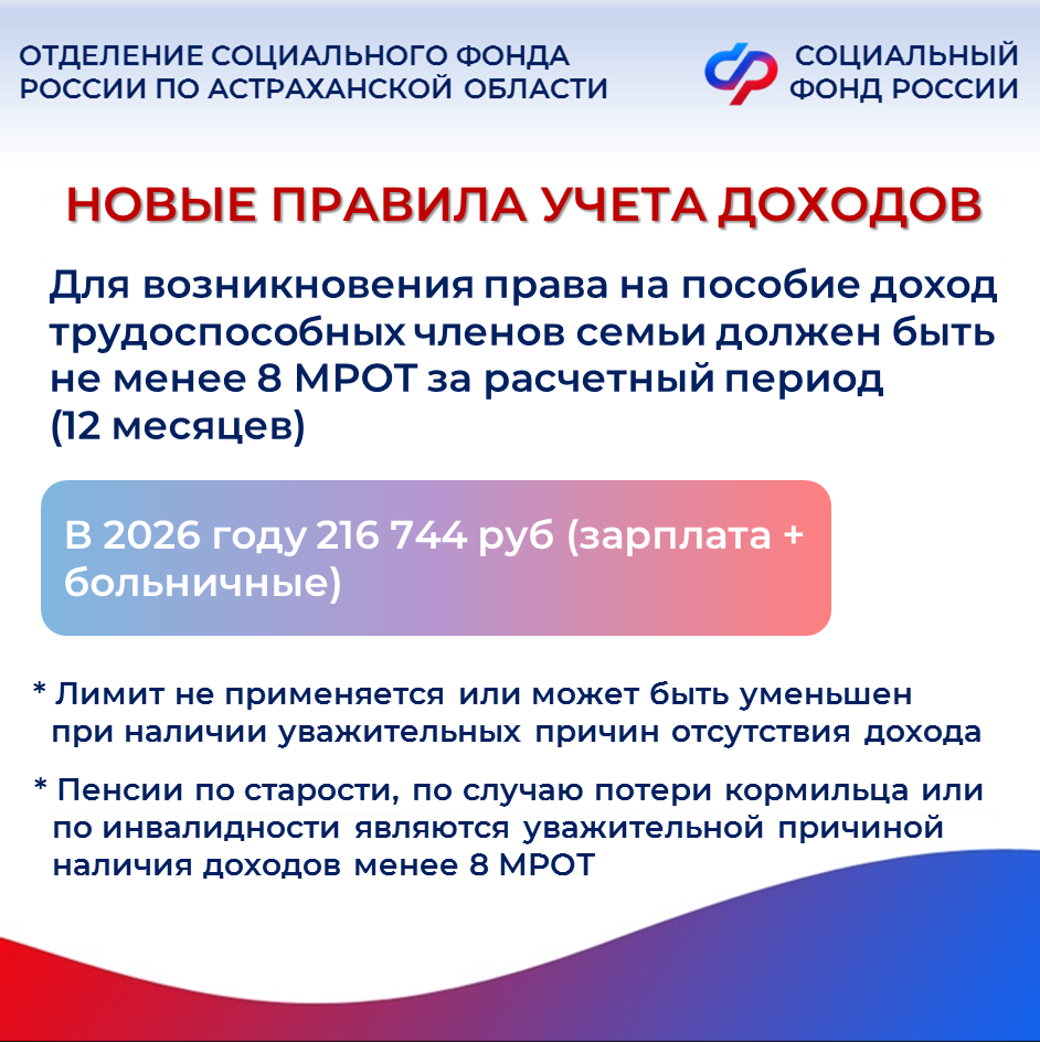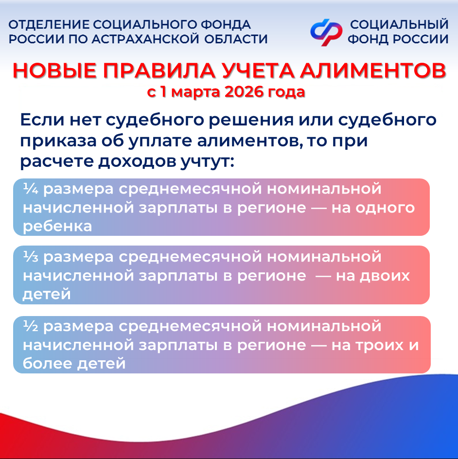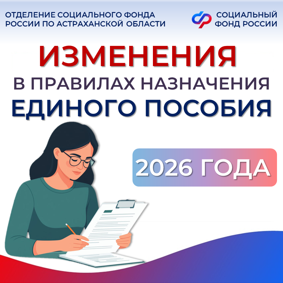 В январе этого года вступили в силу новые изменения в условия назначения единого пособия, предназначенного для малообеспеченных семей, чей среднедушевой доход не превышает величины регионального прожиточного минимума (18 371 руб. на каждого члена семьи в 2026 году). Теперь при проведении комплексной оценки нуждаемости семьи для уточнения права на единое пособие Отделение СФР по Астраханской области не учитывает в перечне доходов семьи единовременные материальные выплаты от работодателя при рождении или усыновлении ребенка. Также в него не включается ежемесячная финансовая помощь жителям Курской области, лишившимся жилья и другого имущества в результате действий украинских вооруженных формирований. С этого года изменились и требования к доходам: для возникновения права на единое пособие необходимо за расчетный период иметь доход в размере не менее 8 МРОТ на каждого трудоспособного члена семьи (216 744 руб. за 12 месяцев до месяца, предшествующего обращению). В эту сумму при расчете теперь также включают пособие по временной нетрудоспособности. Важно отметить, что при наличии уважительных причин отсутствия заработка Отделение СФР по Астраханской области может уменьшить требование к наличию дохода в размере не менее 8 МРОТ. Важное нововведение этого года: с 1 января получение пенсий по старости, по случаю потери кормильца или по инвалидности является уважительной причиной. С полным перечнем можно ознакомиться на сайте СФР. С 1 марта 2026 года меняется порядок учета алиментов. Если у заявителя нет судебного решения или судебного приказа об уплате алиментов, то при определении права на единое пособие алименты будут учитываться в следующих размерах: ¼ размера среднемесячной номинальной начисленной зарплаты в регионе — на одного ребенка; ⅓ размера среднемесячной номинальной начисленной зарплаты в регионе — на двоих детей; ½ размера среднемесячной номинальной начисленной зарплаты в регионе — на троих и более детей. Если же алименты установлены судом, то так же как и сейчас в доход семьи будут засчитываться только фактически перечисляемые суммы, указанные в заявлении о назначении единого пособия. Пример: средняя номинальная начисленная зарплата в Астраханской области, по данным регионального подразделения Росстата, за первое полугодие 2025 года достигла 67,6 тысячи рублей. У гражданина двое детей, соответственно условные алименты составляют ⅓ размера среднемесячной номинальной начисленной зарплаты в регионе. 67 600/3=22 533,3 руб. – такая сумма будет автоматически учитываться в доходы заявителя при отсутствии заверенного судом документа об установленной сумме алиментов. Если у вас остались вопросы, вы всегда можете обратиться к специалистам , позвонив в единый контакт-центр : 8(800)100-00-01 (звонок бесплатный). Наши операторы готовы ответить вам с понедельника по четверг с 8:00 до 17:00 часов, в пятницу с 8.00 до 16.00.